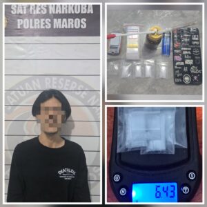 Kilastimur.com – Maros — Polres Maros kembali berhasil mengungkap kasus peredaran narkotika di Kabupaten Maros. Seorang pria berinisial AF (24), warga Kelurahan Turikale, Kecamatan Turikale, Kabupaten Maros, ditangkap bersama sejumlah barang bukti narkotika jenis sabu seberat 6,43 gram.