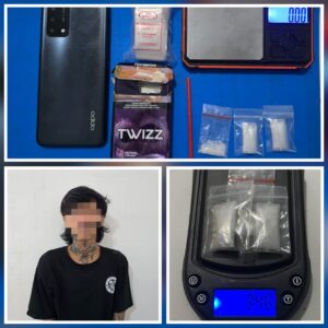 Dari tangan pelaku, petugas mengamankan tiga saset plastik bening berisi diduga sabu dengan berat total 3,46 gram, satu unit handphone Oppo warna hitam, satu alat timbang digital, satu pak saset plastik bening siap pakai, satu pipet merah kecil, serta satu bungkus rokok bekas merk Twizz.