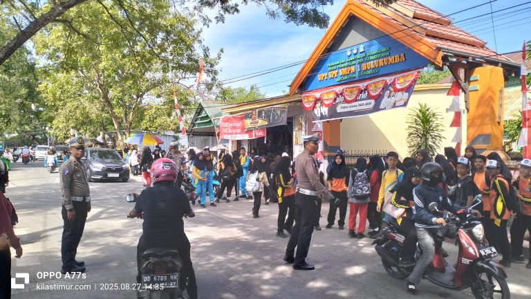 Kilastimur.com – Bulukumba – Personel Satuan Lalu Lintas Polres Bulukumba melakukan pengamanan arus lalu lintas saat jam pulang sekolah di SMP Negeri 1 Bulukumba, Jalan Teratai No.5B, Kelurahan Caile, Kecamatan Ujung Bulu, Kabupaten Bulukumba, Sulawesi Selatan.