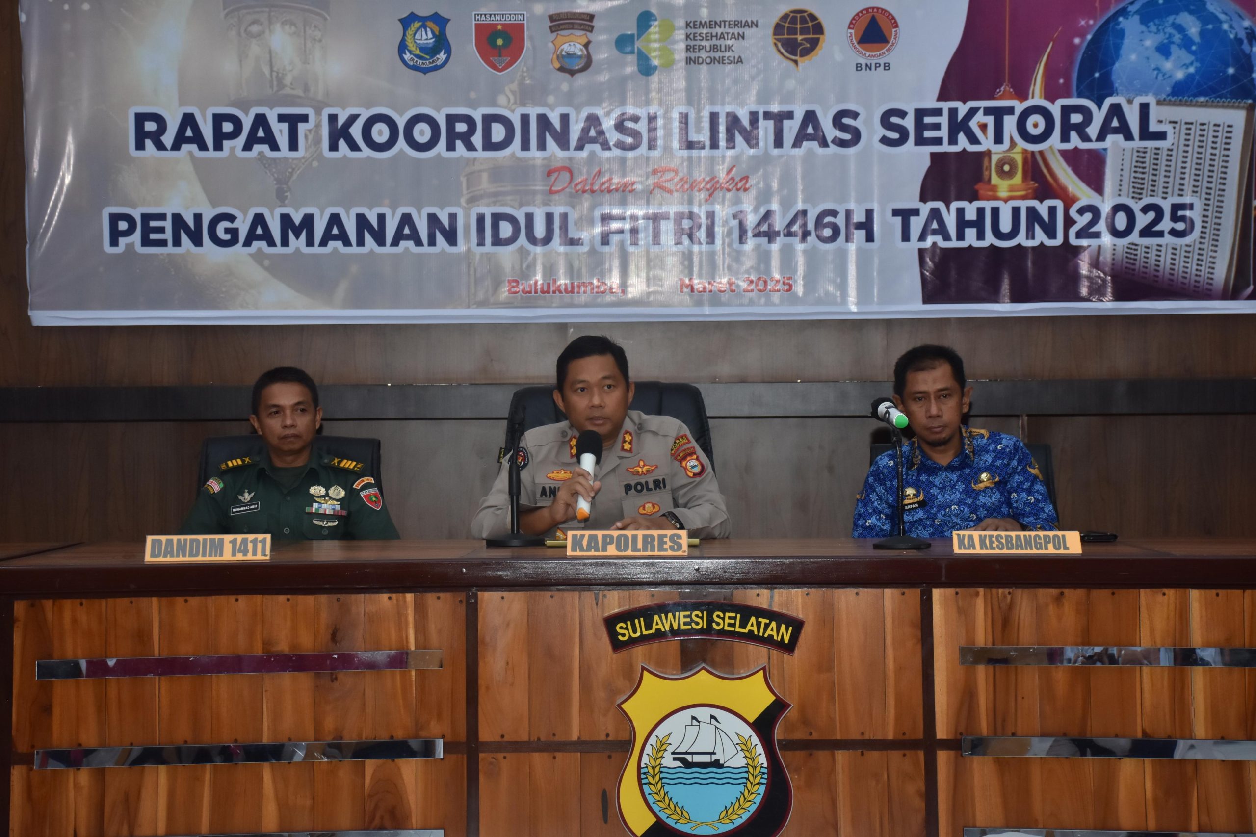 Kapolres Bulukumba AKBP Andi Erma Suryono dalam sambutannya menyampaikan bahwasanya rapat koordinasi ini bertujuan untuk membahas pengamanan jelang Idul Fitri dan memastikan bahwa keamanan dan ketertiban masyarakat tetap terjaga.